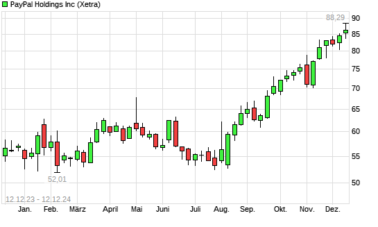 Mit dem Anstieg auf 86,30 EUR hat die PayPal-Aktie (ISIN US70450Y1038) am 11.12.2024 ein neues 12-Monats-Hoch erreicht und damit den Kurs vom 09.12.2024 eingestellt.