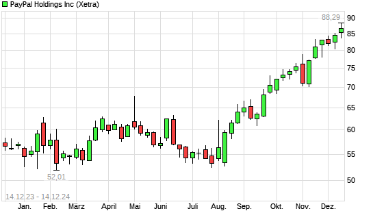 Mit dem Anstieg auf 86,83 EUR hat die PayPal-Aktie (ISIN US70450Y1038) am 13.12.2024 ein neues 12-Monats-Hoch erreicht und damit den Kurs vom 11.12.2024 eingestellt.