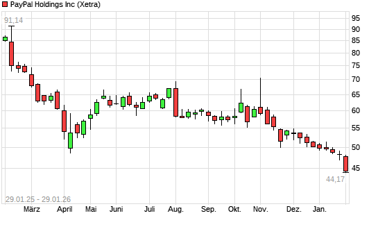 Mit dem Rücksetzer auf 45,05 EUR hat die PayPal-Aktie (ISIN US70450Y1038) am 28.01.2026 ein neues 5-Jahres-Tief erreicht und damit den Kurs vom 27.01.2026 eingestellt.