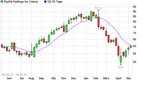 Mit dem Anstieg auf 60,79 EUR hat die PayPal-Aktie am 05.05.2025 die 50-Tage-Linie nach oben gekreuzt.