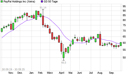 Mit dem Anstieg auf 59,51 EUR hat die PayPal-Aktie am 29.09.2025 die 50-Tage-Linie nach oben gekreuzt.