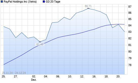 Mit dem Rücksetzer auf 83,35 EUR hat die PayPal-Aktie am 23.12.2024 die 20-Tage-Linie nach unten gekreuzt.