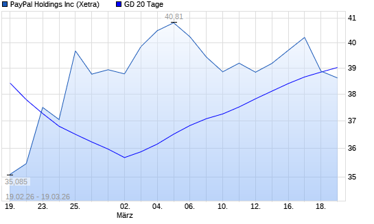 Mit dem Rücksetzer auf 38,99 EUR hat die PayPal-Aktie am 18.03.2026 die 20-Tage-Linie nach unten gekreuzt.