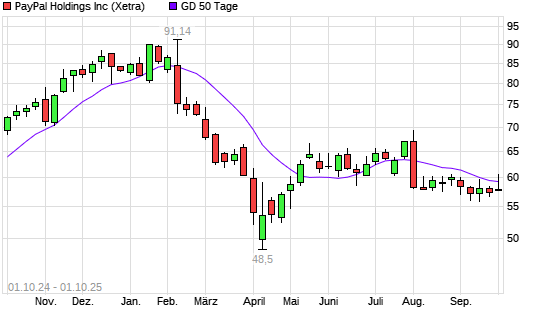 Mit dem Rücksetzer auf 57,30 EUR hat die PayPal-Aktie am 30.09.2025 die 50-Tage-Linie nach unten gekreuzt.