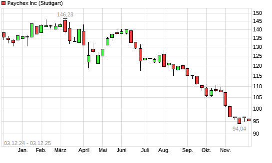 Mit dem Rücksetzer auf 94,17 EUR hat die Paychex-Aktie (ISIN US7043261079) am 02.12.2025 ein neues 3-Jahres-Tief erreicht und damit den Kurs vom 20.11.2025 eingestellt.