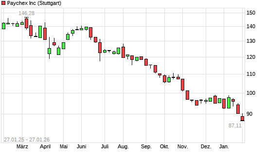 Mit dem Rücksetzer auf 88,73 EUR hat die Paychex-Aktie (ISIN US7043261079) am 26.01.2026 ein neues 3-Jahres-Tief erreicht und damit den Kurs vom 23.01.2026 eingestellt.