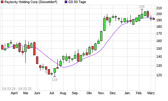 Mit dem Anstieg auf 194,00 EUR hat die Paylocity Holding-Aktie am 03.03.2025 die 50-Tage-Linie nach oben gekreuzt.