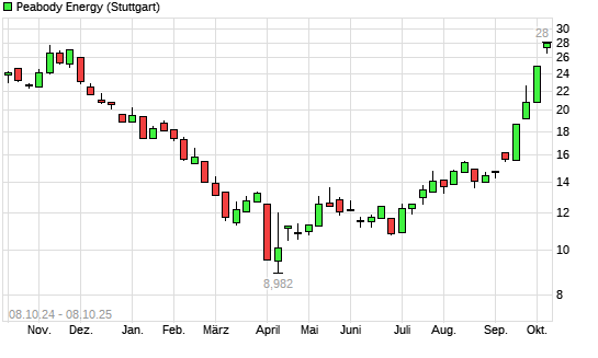 Mit dem Anstieg auf 28,14 EUR hat die Peabody Energy-Aktie (ISIN US7045511000) am 07.10.2025 ein neues 12-Monats-Hoch erreicht und damit den Kurs vom 06.10.2025 eingestellt.