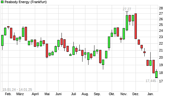 Mit dem Rücksetzer auf 17,55 EUR hat die Peabody Energy-Aktie (ISIN US7045511000) am 13.01.2025 ein neues 12-Monats-Tief erreicht und damit den Kurs vom 10.01.2025 eingestellt.