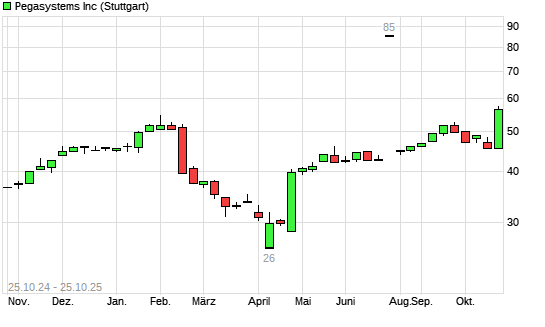 Mit dem Anstieg auf 55,50 EUR hat die Pegasystems-Aktie (ISIN US7055731035) am 24.10.2025 ein neues 3-Jahres-Hoch erreicht und damit den Kurs vom 22.10.2025 eingestellt.