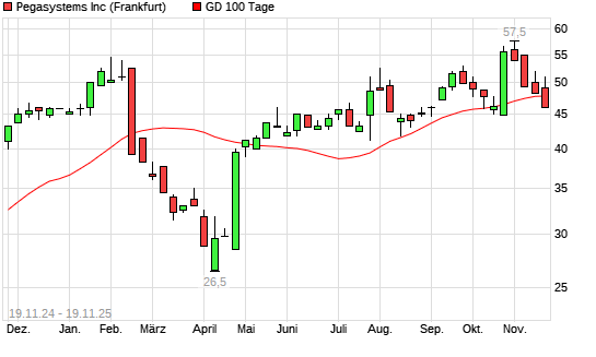 Mit dem Rücksetzer auf 46,40 EUR hat die Pegasystems-Aktie am 18.11.2025 die 100-Tage-Linie nach unten gekreuzt.