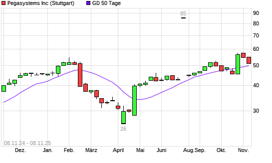 Mit dem Rücksetzer auf 49,40 EUR hat die Pegasystems-Aktie am 07.11.2025 die 50-Tage-Linie nach unten gekreuzt.
