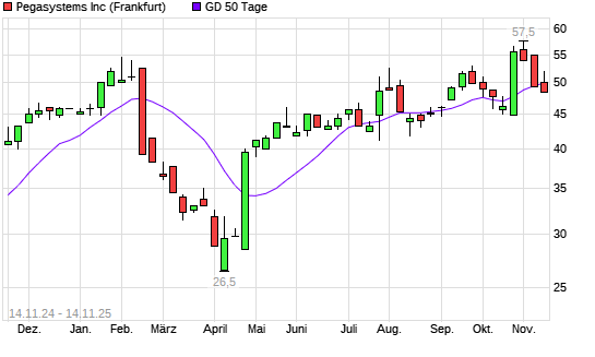Mit dem Rücksetzer auf 49,60 EUR hat die Pegasystems-Aktie am 13.11.2025 die 50-Tage-Linie nach unten gekreuzt.