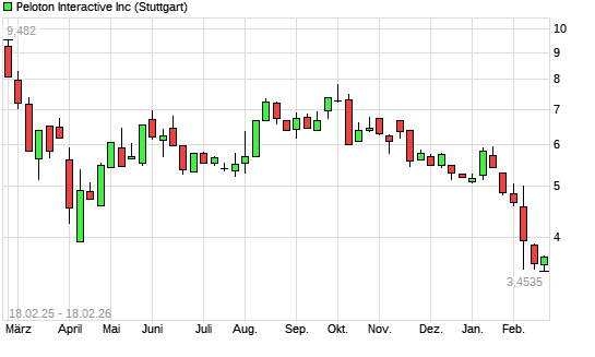 Mit dem Rücksetzer auf 3,48 EUR hat die Peloton Interactive-Aktie (ISIN US70614W1009) am 17.02.2026 ein neues 12-Monats-Tief erreicht und damit den Kurs vom 12.02.2026 eingestellt.