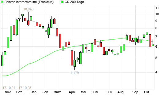 Mit dem Rücksetzer auf 6,45 EUR hat die Peloton Interactive-Aktie am 16.10.2025 die 200-Tage-Linie nach unten gekreuzt.