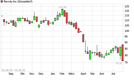 Mit dem Rücksetzer auf 74,86 EUR hat die PerkinElmer-Aktie (ISIN US7140461093) am 01.08.2025 ein neues 5-Jahres-Tief erreicht und damit den Kurs vom 10.11.2023 eingestellt.