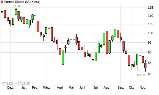 Mit dem Rücksetzer auf 81,28 EUR hat die Pernod Ricard-Aktie (ISIN FR0000120693) am 06.11.2025 ein neues 10-Jahres-Tief erreicht und damit den Kurs vom 30.09.2025 eingestellt.