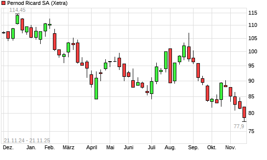 Mit dem Rücksetzer auf 78,68 EUR hat die Pernod Ricard-Aktie (ISIN FR0000120693) am 20.11.2025 ein neues 10-Jahres-Tief erreicht und damit den Kurs vom 19.11.2025 eingestellt.