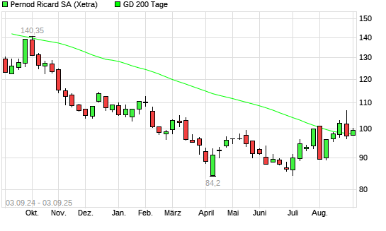 Mit dem Rücksetzer auf 97,80 EUR hat die Pernod Ricard-Aktie am 02.09.2025 die 200-Tage-Linie nach unten gekreuzt.