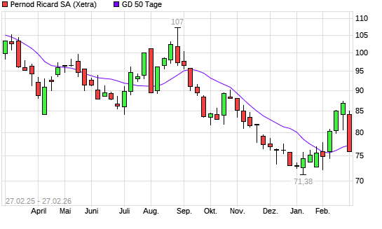 Pernod Ricard ist Teil des 1706 Titel umfassenden Anlageuniversum der boerse.de-Signale Aktien Welt. In der großen Trendauswertung vom 27.02.2026 ist der Titel von Rang 1279 auf Rang ...weiterlesen