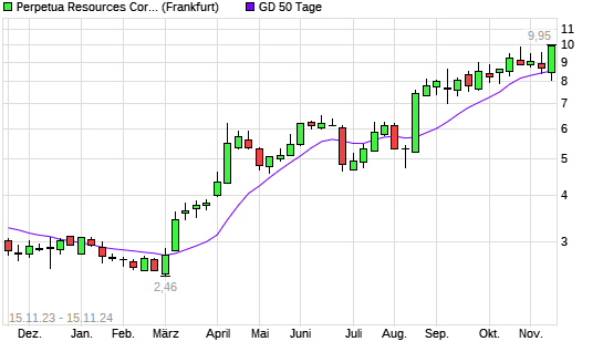 Mit dem Anstieg auf 8,50 EUR hat die Perpetua Resources-Aktie am 14.11.2024 die 50-Tage-Linie nach oben gekreuzt.