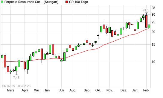 Mit dem Rücksetzer auf 21,90 EUR hat die Perpetua Resources-Aktie am 05.02.2026 die 100-Tage-Linie nach unten gekreuzt.