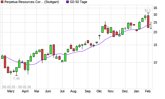 Mit dem Rücksetzer auf 24,00 EUR hat die Perpetua Resources-Aktie am 04.02.2026 die 50-Tage-Linie nach unten gekreuzt.