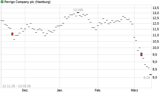 Mit dem Rücksetzer auf 8,33 EUR hat die Perrigo Company-Aktie (ISIN IE00BGH1M568) am 12.03.2026 ein neues All-Time-Low erreicht und damit den Kurs vom 11.03.2026 eingestellt.