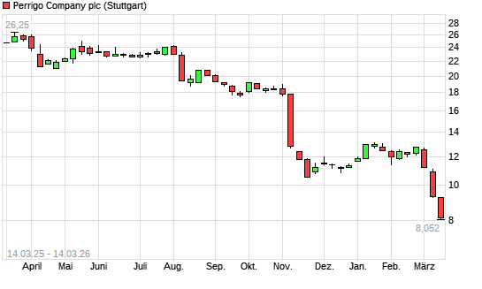 Mit dem Rücksetzer auf 8,04 EUR hat die Perrigo Company-Aktie (ISIN IE00BGH1M568) am 13.03.2026 ein neues All-Time-Low erreicht und damit den Kurs vom 12.03.2026 eingestellt.