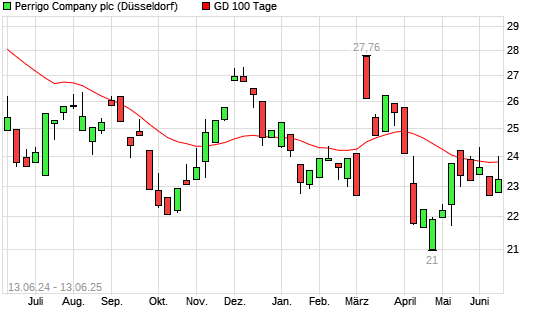 Mit dem Rücksetzer auf 23,51 EUR hat die Perrigo Company-Aktie am 12.06.2025 die 100-Tage-Linie nach unten gekreuzt.