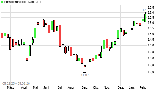 Mit dem Anstieg auf 17,00 EUR hat die Persimmon-Aktie (ISIN GB0006825383) am 04.02.2026 ein neues 12-Monats-Hoch erreicht und damit den Kurs vom 03.02.2026 eingestellt.