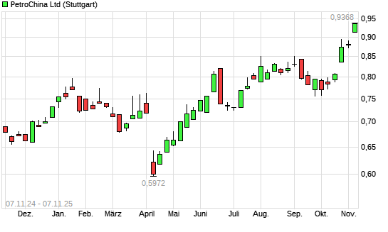 Mit dem Anstieg auf 0,95 EUR hat die PetroChina-Aktie (ISIN CNE1000003W8) am 06.11.2025 ein neues 12-Monats-Hoch erreicht und damit den Kurs vom 05.11.2025 eingestellt.