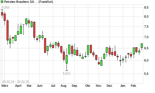 Mit dem Anstieg auf 6,67 EUR hat die Petroleo Brasileiro-Aktie (ISIN BRPETRACNPR6) am 19.02.2025 ein neues 6-Monats-Hoch erreicht und damit den Kurs vom 28.08.2024 eingestellt.