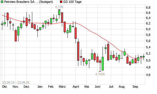 Mit dem Rücksetzer auf 5,10 EUR hat die Petroleo Brasileiro-Aktie am 22.09.2025 die 100-Tage-Linie nach unten gekreuzt.