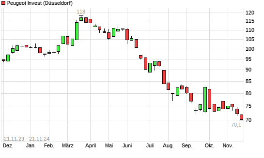 Mit dem Rücksetzer auf 70,20 EUR hat die Peugeot Invest-Aktie (ISIN FR0000064784) am 20.11.2024 ein neues 3-Jahres-Tief erreicht und damit den Kurs vom 19.11.2024 eingestellt.