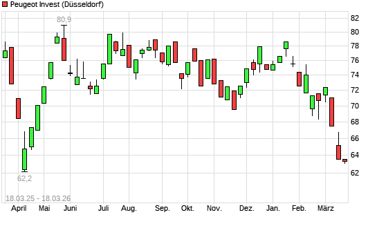 Mit dem Rücksetzer auf 62,00 EUR hat die Peugeot Invest-Aktie (ISIN FR0000064784) am 17.03.2026 ein neues 6-Monats-Tief erreicht und damit den Kurs vom 13.03.2026 eingestellt.