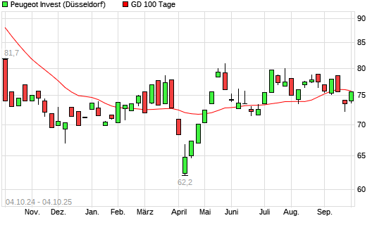 Mit dem Anstieg auf 77,20 EUR hat die Peugeot Invest-Aktie am 03.10.2025 die 100-Tage-Linie nach oben gekreuzt.