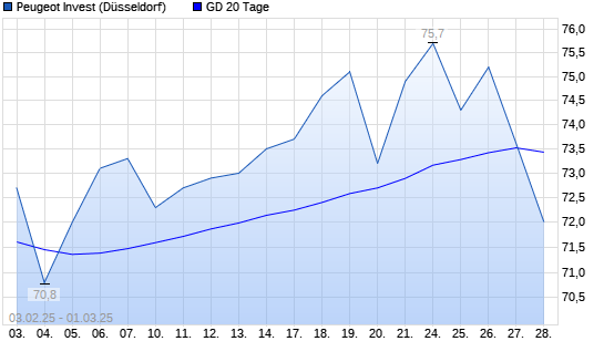 Mit dem Anstieg auf 73,10 EUR hat die Peugeot Invest-Aktie am 28.02.2025 die 20-Tage-Linie nach oben gekreuzt.