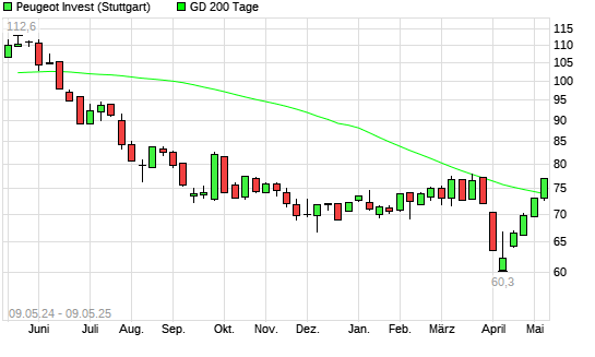 Mit dem Anstieg auf 75,00 EUR hat die Peugeot Invest-Aktie am 08.05.2025 die 200-Tage-Linie nach oben gekreuzt.
