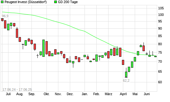 Mit dem Anstieg auf 73,20 EUR hat die Peugeot Invest-Aktie am 16.06.2025 die 200-Tage-Linie nach oben gekreuzt.