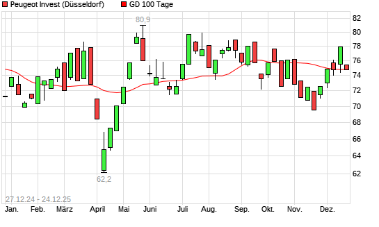 Mit dem Rücksetzer auf 74,20 EUR hat die Peugeot Invest-Aktie am 23.12.2025 die 100-Tage-Linie nach unten gekreuzt.