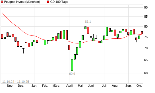 Mit dem Rücksetzer auf 75,20 EUR hat die Peugeot Invest-Aktie am 10.10.2025 die 100-Tage-Linie nach unten gekreuzt.Die Peugeot Invest-Aktie befindet sich seit dem 30.09.2025 im langfristigen ...weiterlesen