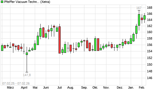 Mit dem Anstieg auf 166,00 EUR hat die Pfeiffer Vacuum-Aktie (ISIN DE0006916604) am 06.02.2026 ein neues 12-Monats-Hoch erreicht und damit den Kurs vom 03.02.2026 eingestellt.