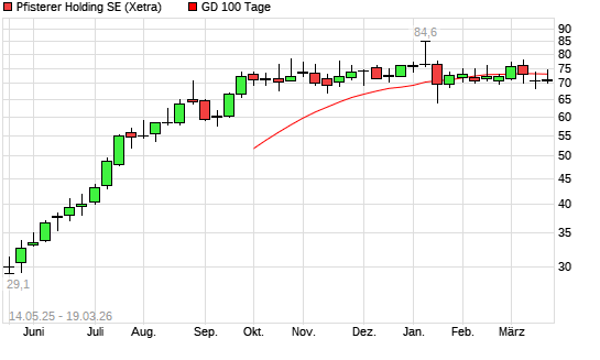 Mit dem Rücksetzer auf 72,90 EUR hat die Pfisterer Holding SE-Aktie am 18.03.2026 die 100-Tage-Linie nach unten gekreuzt.
