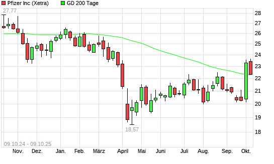 Mit dem Rücksetzer auf 22,09 EUR hat die Pfizer-Aktie am 08.10.2025 die 200-Tage-Linie nach unten gekreuzt.