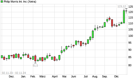Mit dem Anstieg auf 122,34 EUR hat die Philip Morris International-Aktie (ISIN US7181721090) am 01.11.2024 ein neues All-Time-High erreicht und damit den Kurs vom 24.10.2024 eingestellt.