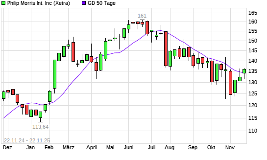 Mit dem Anstieg auf 136,18 EUR hat die Philip Morris International-Aktie am 21.11.2025 die 50-Tage-Linie nach oben gekreuzt.