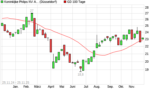 Mit dem Anstieg auf 23,40 EUR hat die Philips Electronics ADR-Aktie am 24.11.2025 die 100-Tage-Linie nach oben gekreuzt.