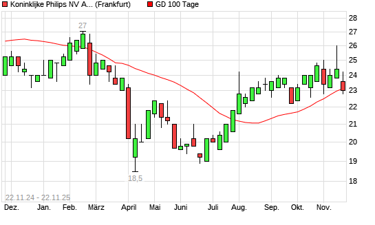 Mit dem Rücksetzer auf 23,00 EUR hat die Philips Electronics ADR-Aktie am 21.11.2025 die 100-Tage-Linie nach unten gekreuzt.