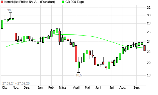 Mit dem Rücksetzer auf 22,20 EUR hat die Philips Electronics ADR-Aktie am 26.09.2025 die 200-Tage-Linie nach unten gekreuzt.